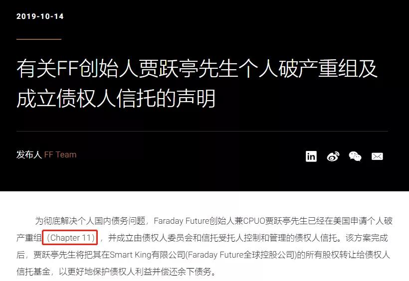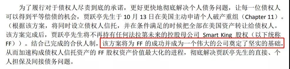 贾跃亭实际所采用的,是第十一章即“个人破产重组”的方式。在他的方案中,债权人会成立一个信托,而贾跃亭将自己持有的FF的股权转移到信托里面。