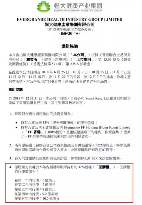 去年关注FF与恒大撕逼的朋友一定记得,在2018年的最后一天,恒大健康(708)发布公告,终结了两家之间的纠纷。和解协议中,有一条是“贾跃亭可以在未来5年内回购恒大持有的FF的32%的股权”。