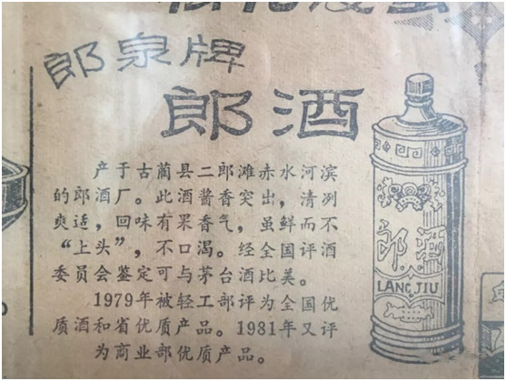 川酿白酒体验馆收藏一份1981年的老报纸,内容均为四川地区的各种优质产品介绍。其中郎酒的介绍中有一句话——经全国评酒委员会鉴定可与茅台酒比美。