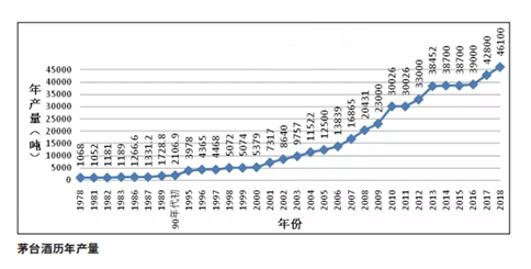 查询1971—2017年间茅台酒每年的产量,会发现1971年茅台酒的产量是375吨,2014年的产量是38700吨,2017年更是突破了4万吨,达到了42800吨,40多年间,茅台的产量增长了100多倍。这说明,茅台的产量是可以大量增长的,而且可以在短时间内快速增长。