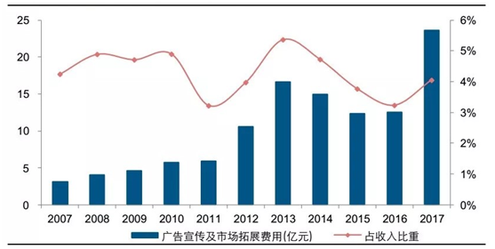 与营收增速变化完全相反的是,茅台的广告宣传和市场拓展费用持续走高。2012年,茅台甚至直接砸钱4.43亿元,成为央视的新标王。对茅台来说,在特供渠道被限制之后,通过广告投入来扩大市场渠道是应急策略之一。茅台的“国酒”品牌需要更加深入人心。