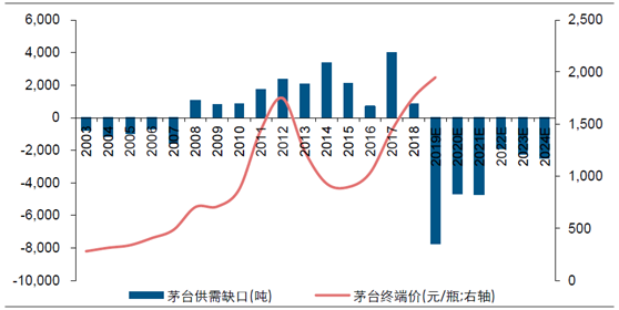 根据长江证券研究所测算,在2008年前茅台酒存在供需缺口,但是2008-2018年的情况是供大于求,在此情况下,茅台酒终端零售价依旧居高不下,期间价格下跌是受周期影响。